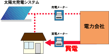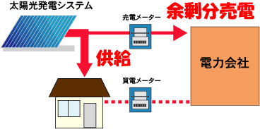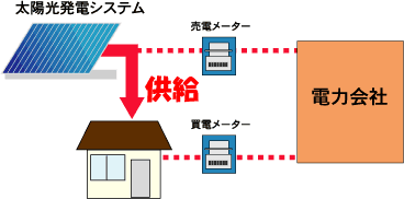 太陽電池の発電量が、家庭内電気機器の消費電力より多い場合、余った電気は「逆潮流」として商用電力系統に送られ、電力会社に売ることができます。