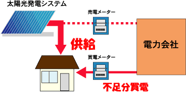 太陽電池の発電量だけで、家庭内電気機器の消費電力をまかないきれない場合は、不足分を電力会社の電力でまかないます。