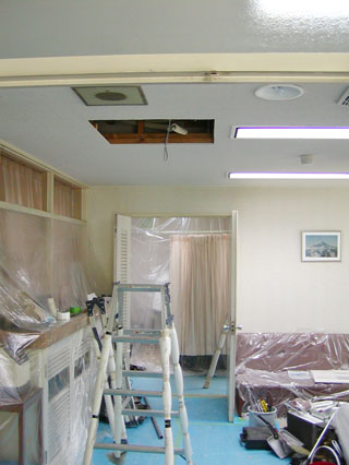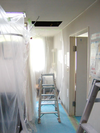 天井開口部をつくり、配管作業途中の状態。 |