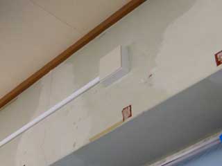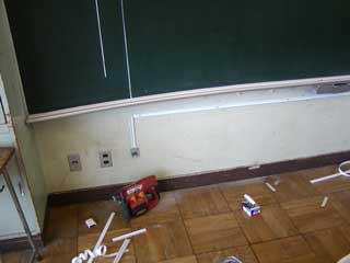 | 教室正面黒板下部にネットワークケーブルを引き、コネクタを設置。 |